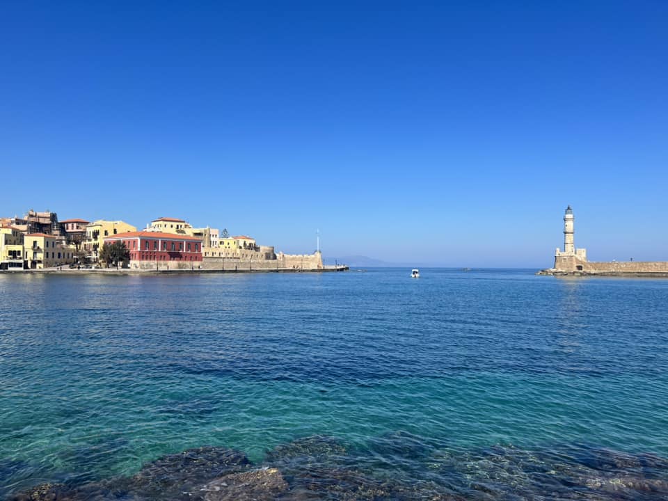 I briskly walked out of the curvy narrow streets of Chania’s old town to the waterfront. My breath was caught by what I saw. The horizon glowed an encouraging orange and pink stripe. The sky high above still had a star or two. To my right was the Turkish bathhouse (now a museum) and across was the lighthouse. Men sat fishing, chatting quietly in their chairs on the sea wall. It was as perfect as a perfect morning on a Greek island could be—because I witnessed it. I would never have seen this early morning experience of Chania Crete before I became a runner.