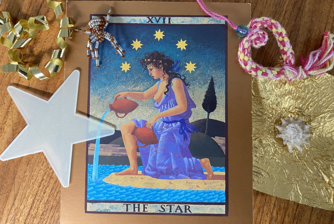 On the cover was a woman in a blue dress pouring water from a container, around her head a halo of five stars. At the bottom were the words The Star. It was an image from a tarot deck of The Star card. Inside the student had written: