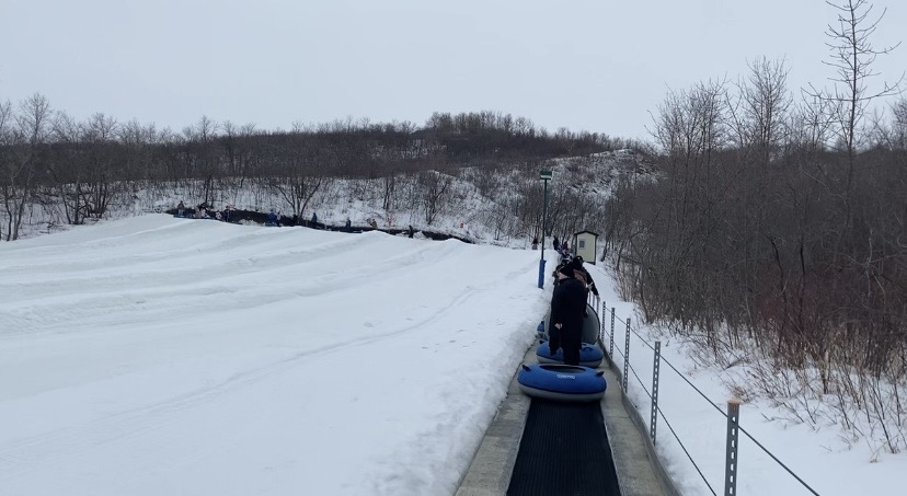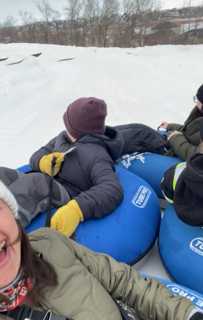 We arrived and walked to the bottom of the hill designated for tubing (or tiring—oh, wait, that doesn’t sound good. Sounds like being tired. Fine! Tubing it is). The air had that sharp, clean cold that wakes you right up, and you could hear bursts of laughter and the occasional scream echoing down the hill. We got a very short lesson on how to use the tubes and which lanes were for what—delivered with the kind of efficiency that suggested we should already know what we were doing. I nodded along as if I did.